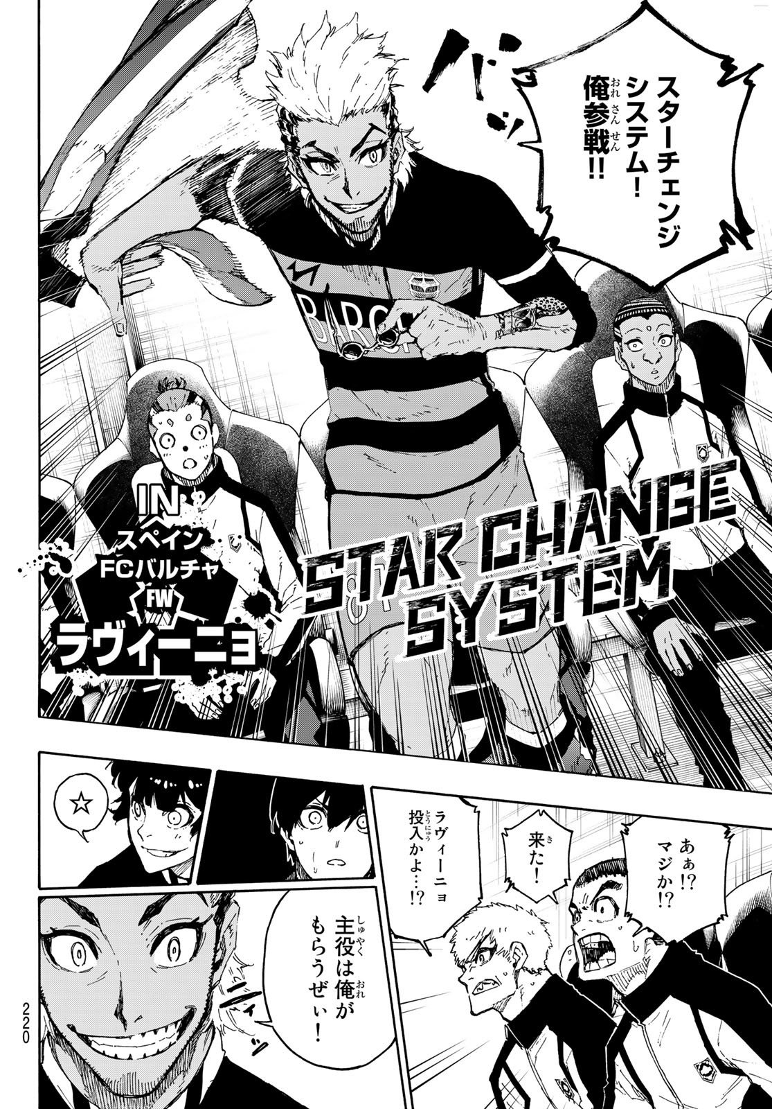 ブルーロック第164話では、イサギが試合中の状況を分析し、自分の武器を活かす最適な動きを模索する姿が描かれる。カイザーや凛との駆け引きも続き、試合全体の緊張感が高まる回となっている。 ブルーロック第163話 | ブルーロック第165話